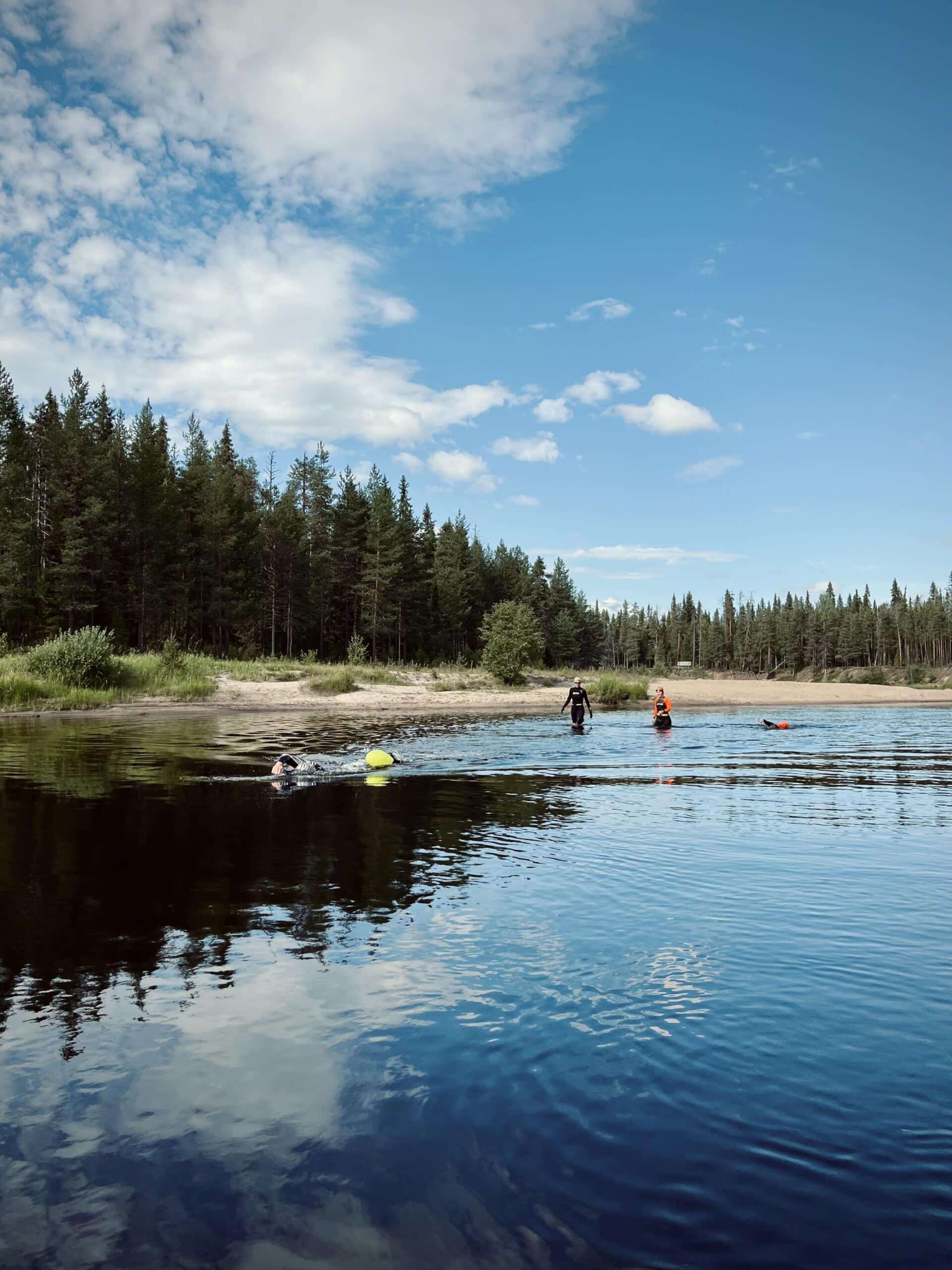 During the swim, you follow the natural current of the Oulanka River – essentially swimming “downhill.” The flow helps you move faster and makes the swim surprisingly easy. There are two route options: 12 km or 24 km.